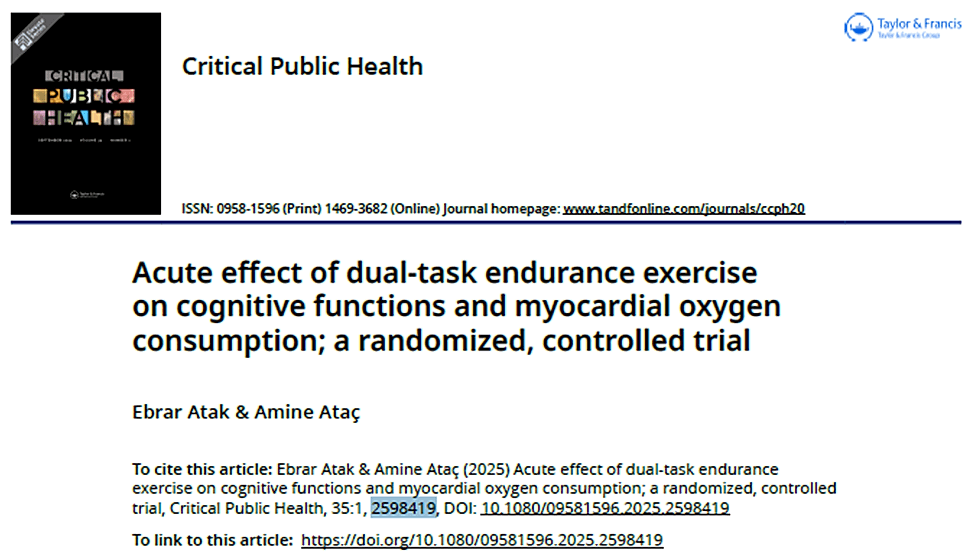 Üniversitemiz Fizyoterapi ve Rehabilitasyon Bölümü öğretim üyesi Dr. Öğr. Üyesi Amine Ataç’ın özgün araştırma makalesi olan “Acute effect of dual-task endurance exercise on cognitive functions and myocardial oxygen consumption; a randomized, controlled trial” başlıklı makale, Taylor & Francis yayınevine bağlı Web of Sciences (WOS) SCIE indeks Q2 kategorisindeki Clinical Public Health dergisinde yayınlandı.
