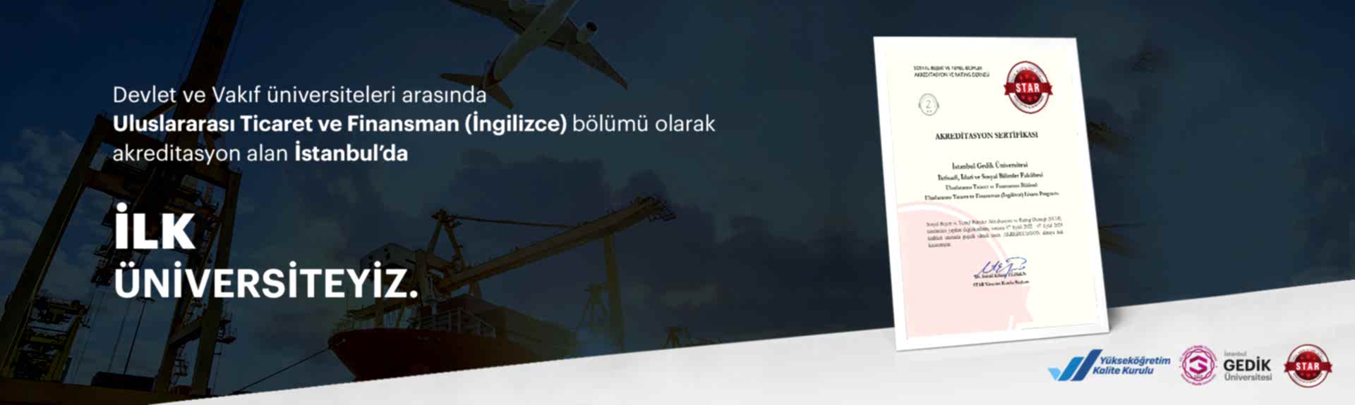 İstanbul Gedik Üniversitesi İktisadi, İdari ve Sosyal Bilimler Fakültesi Uluslararası Ticaret ve Finansman (İngilizce) Bölümü, Yükseköğretim Kurulu Başkanlığı tarafından yetkilendirilmiş olan STAR Sosyal Beşeri ve Temel Bilimler Akreditasyon ve Rating Derneği’ (S.T.A.R) tarafından 07.09.2022-07.09.2024 tarihleri arasında iki (2) yıl geçerli olmak üzere akredite edilerek STAR Akreditasyon Sertifikası almaya hak kazanmıştır.